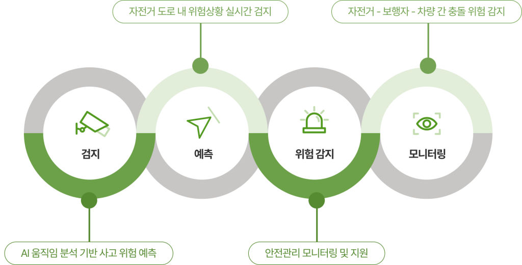 자전거도로 내 위험 상황을 AI 영상 분석 기술실시간 검지하고, 사고 가능성을 사전에 예측하여 안전한 자전거 주행 환경을 지원하는 시스템입니다.